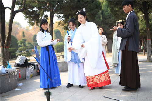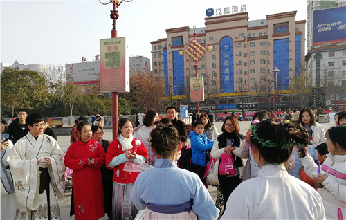 11月25日,周口的漢服同袍以“漢服出行,不忘初心”為主題自發(fā)相約在人民公園、五一廣場(chǎng)等地向行人宣傳漢服文化。