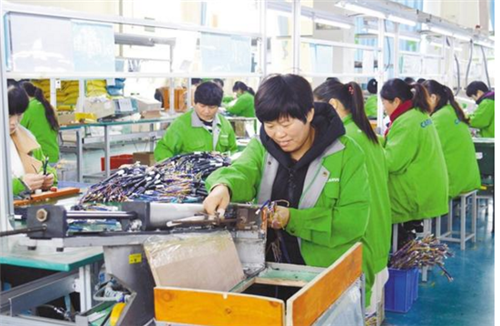 近年來,沈丘縣凱旺電子公司先后在石槽集鄉、馮營鎮、付井鎮等9個鄉鎮設立了27個扶貧車間,吸納了700多人就業,其中包括160名貧困群眾,人均月工資為2000至3000元。圖為扶貧車間里的生產場景。