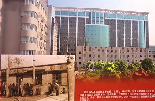 河南電視臺(tái)記者陳貞君在展覽板前介紹,這里是位于第四展區(qū)的兩幅同一所醫(yī)院的照片——河南省鄲城縣人民醫(yī)院,這張是1979年冬天,鄲城縣人民醫(yī)院創(chuàng)建了我國縣級醫(yī)院第一個(gè)顯微外科,這就是當(dāng)時(shí)的顯微外科的手術(shù)室和病房的外景,這張是2017年的鄲城縣人民醫(yī)院。可以說改革開放讓同一所醫(yī)院有了滄海桑田般的變遷。