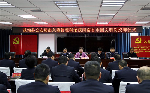 12月26日,扶溝縣長張穎波向榮獲河南省“巾幗文明崗”的縣公安局出入境管理科授牌儀式在縣公安局九樓會議室舉行。副縣長任松奎,縣政府黨組成員、縣公安局局長田豪杰,縣公安局政委石偉等出席授牌儀式。