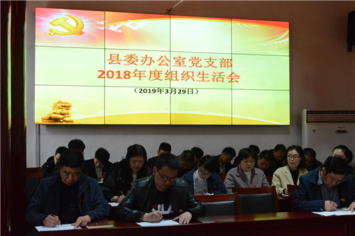 3月29日下午,鹿邑縣委辦公室黨支部召開(kāi)2018年度組織生活會(huì)并開(kāi)展民主評(píng)議黨員活動(dòng)。縣委書(shū)記梁建松,縣委常委、辦公室主任宋濤以一名普通黨員身份參加會(huì)議。縣委辦公室機(jī)關(guān)全體同志參加會(huì)議。