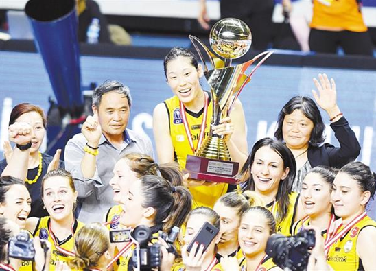 5月5日,瓦基弗銀行隊球員朱婷(中上)邀請父母進入球場慶祝奪冠。 當日,在2018-2019賽季土耳其女排超級聯賽決賽第五回合比賽中,瓦基弗銀行隊客場以3比0戰勝伊薩奇巴希隊,以總比分3比2成功衛冕聯賽冠軍。朱婷也蟬聯了聯賽MVP(最有價值球員)稱號。 新華社記者 徐速繪 攝