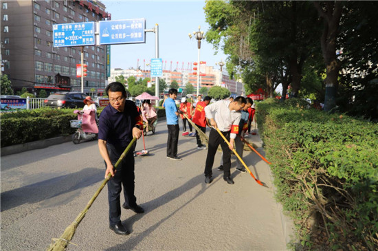 6月4日,烈日炙烤著大地,氣溫升至37攝氏度,路面溫度更高。鄲城縣財政局長張振新帶領“創衛”值班人員,正在新華路西段責任區內清掃路面、撿拾落葉、噴灑花木、落實“門前五包”……大家忙得汗流浹背,始終無一人脫崗。