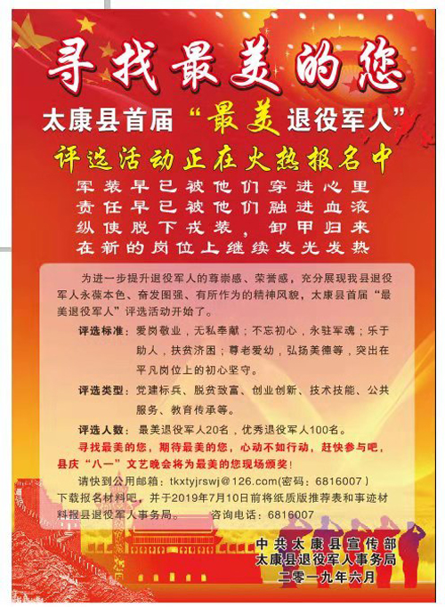 為進一步提升退役軍人的尊崇感、榮譽感,充分展現全縣退役軍人永葆本色、奮發圖強、有所作為的精神風貌,太康縣委宣傳部、太康縣退役軍人事務局從即日起聯合開展首屆“最美退役軍人”評選活動,對全縣退役軍人中涌現出來的黨建標兵、脫貧致富、創業創新、技術技能、公共服務、教育傳承等方面典型代表進行評選表彰。