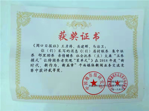 中國地市報(bào)新聞獎(jiǎng)評選活動(dòng)由中國地市報(bào)研究會主辦,每年舉辦一次,在全國有著廣泛的影響,此項(xiàng)新聞獎(jiǎng)評選活動(dòng)涉及全國幾乎所有地市黨報(bào),不僅是展示地市黨報(bào)形象的重要舞臺,也是衡量地市黨報(bào)辦報(bào)水平的重要標(biāo)志,同時(shí)也是以新聞的形式展示各地亮點(diǎn)工作的重要。《太康“五養(yǎng)模式”讓特困養(yǎng)老實(shí)現(xiàn)“菜單式”》稿件在此項(xiàng)新聞獎(jiǎng)評選中,同樣表現(xiàn)不凡,最終榮獲中國地市報(bào)新聞獎(jiǎng)二等獎(jiǎng)。