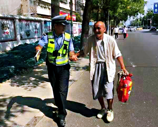 當日9時許,市公安局交通管理支隊二大隊民警畢鵬在轄區建設大道與中州大道交叉口附近執勤時,看到一位老人沿著斑馬線由東向西行走。由于腿腳不便,老人還沒走到馬路中間,路口已經亮起了紅燈。此時,直行和左拐彎的車輛移動起來,老人緊張地站在馬路中間,情況非常危險。