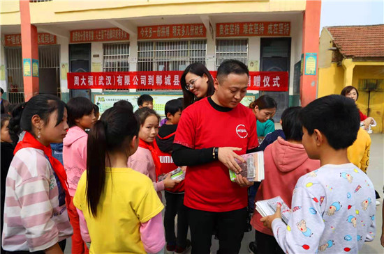 10月24日,周大福河南區域負責人岳磊一行15人,帶著書包、文具、足球、藍球等學習用品,來到鄲城縣丁村鄉徐莊小學,為200余名學生送來了愛心大禮包。并為兩戶貧困戶送去了米面油等慰問品。