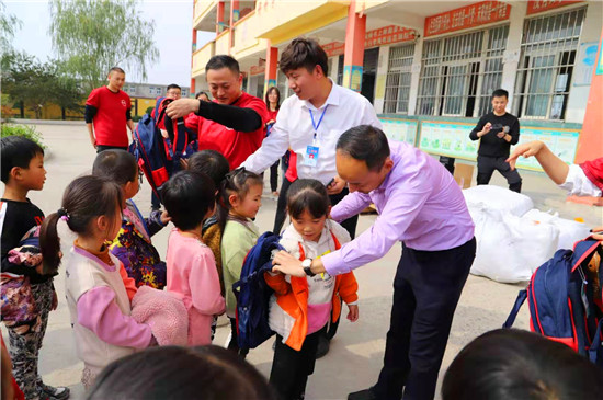 當日上午,周大福集團組織了15名員工組成義工隊,在周口區域負責人王保安的陪同下,帶著總價值3萬余元的300套愛心物資,送到學生手中。現場,他們與學生愛心互動、親切交流,為學生們背上書包、送上文具,關心學生生活和學習情況。當了解到學校資金緊張,師生還沒有統一服裝時。岳磊等人表示,將向上級申請,下一步積極為該校師生解決工作裝和校服問題。對此,徐莊小學師生熱烈鼓掌表示感謝。