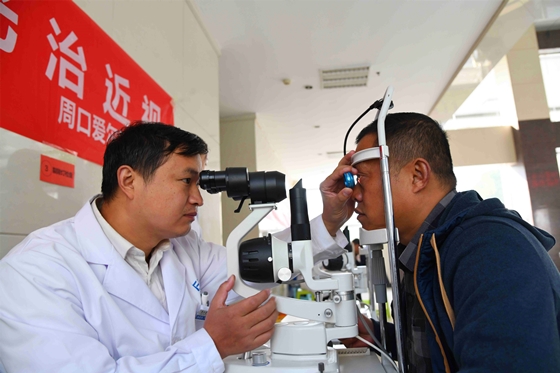 11月8日是記者節。為了讓奔波在新聞戰線,熬夜趕稿、組版的編輯記者眼睛更健康,11月5日,周口愛爾眼科醫院的醫生將儀器搬到周口報業傳媒集團,現場為編輯記者檢查眼睛,關愛新聞工作者的身心健康。圖為眼科醫生為記者檢查視力、實施治療。記者 劉俊濤 梁照曾 攝