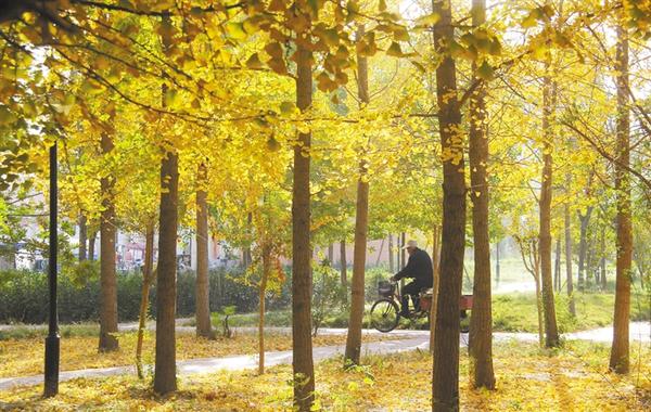 近日,周口市經濟開發區人民廣場,金黃色的楊樹葉在陽光照耀下熠熠生輝,給城市增添一抹亮色。張振海 攝