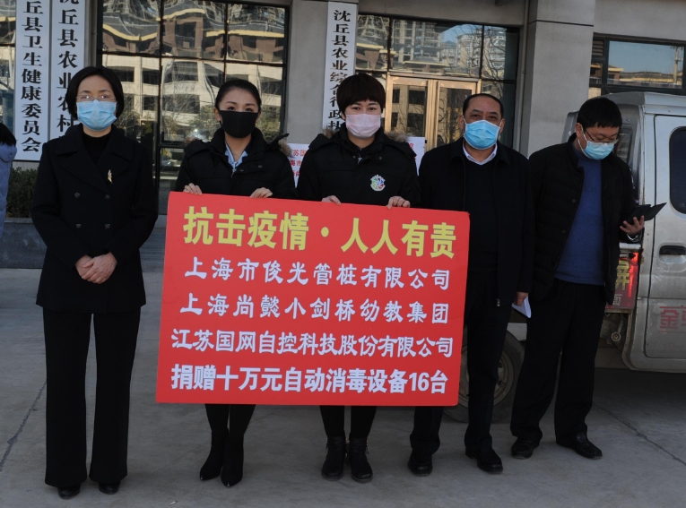 2月18日,在沈丘縣疫情防控指揮部,上海市俊光管樁有限公司、江蘇國網自控科技股份公司、上海上懿小劍橋教育管理有限公司聯合捐贈價值10萬元的自動消毒設備16套,沈丘縣洲業(yè)車業(yè)有限公司(洲業(yè)國際汽車城)捐贈84消毒液(10升/桶)17桶、(5升/桶)166桶,沈丘縣華順農業(yè)建設工程有限公司捐贈75%酒精消毒液(非醫(yī)用)(2.5L/桶x6/件)168件、一次性使用醫(yī)用橡膠檢查手套(100副/盒)53盒,用于疫情防控工作。縣委常委、縣政府黨組成員馬偉,縣政協副主席、縣工商聯主席張瑛,縣政府辦副主任韓向立出席捐贈儀式。