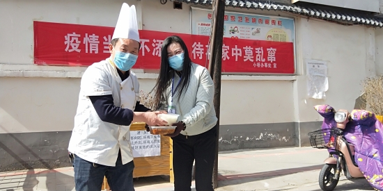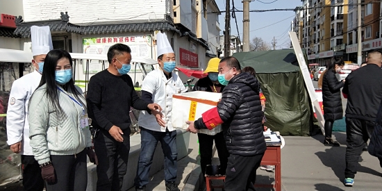 2月22日中午,川匯區小橋辦事處高莊社區疫情防控值勤卡點迎來盛世宴賓樓的大廚們,他們帶著熱騰騰的午餐前來慰問值勤人員,為抗疫一線工作者改善伙食。盛世宴賓樓負責人智廣旭告訴記者,社區疫情防控工作緊張忙碌,他好幾次看到值勤卡點的工作人員用方便面對付一日三餐,心里很感動也很難受,所以飯店決定在疫情結束之前連續贈送午餐晚餐,“讓社區卡點的同志吃好點”。