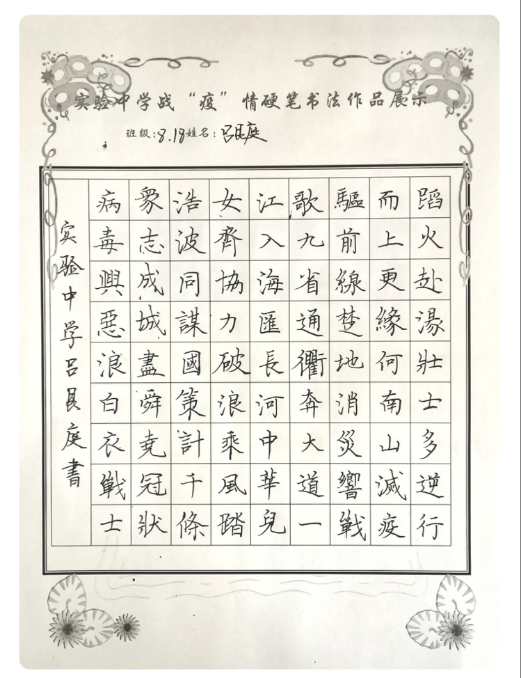 “赴湯蹈火壯士多,逆行而上更緣何。南山滅疫驅前線,楚地消災響戰歌。九省通衢奔大道,一江入海匯長河。中華兒女齊協力,破浪乘風踏浩波......”扶溝縣實驗中學“萬眾一心 抗擊新冠”硬筆書法比賽中,八(18)班呂艮庭同學鄭重地抄錄了這首律詩。