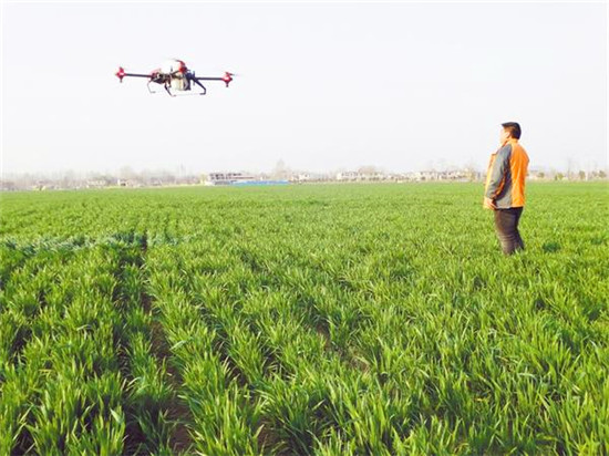 3月24日,在沈丘縣周營鎮平安農業種植合作社訂單優質小麥種植基地,身穿“黃馬甲”的小麥飛防技術員正操作無人機,進行“一噴多防”病蟲害防治,為夏糧豐產豐收奠定基礎。謝辛凌 攝