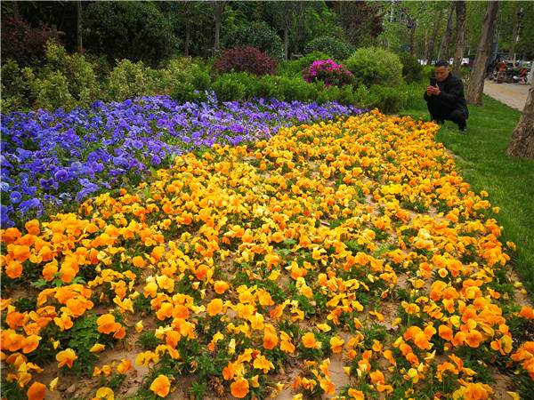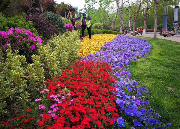 4月20日,在文昌大道道路綠化帶上,市政工人正在為栽種的花卉綠植補充水分。入春以來,我市城區一直在進行美化綠化,現在各個街道逐漸顯現出絢麗身姿。市民走在市區的每個街道都能看到各色花卉、綠植,很是養眼。