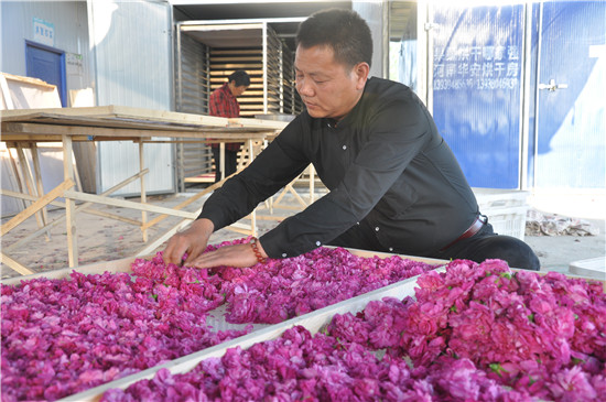 4月29日上午,在商水縣平店鄉雒莊村千畝玫瑰園內,花農劉軍停正忙著分揀藥用玫瑰。