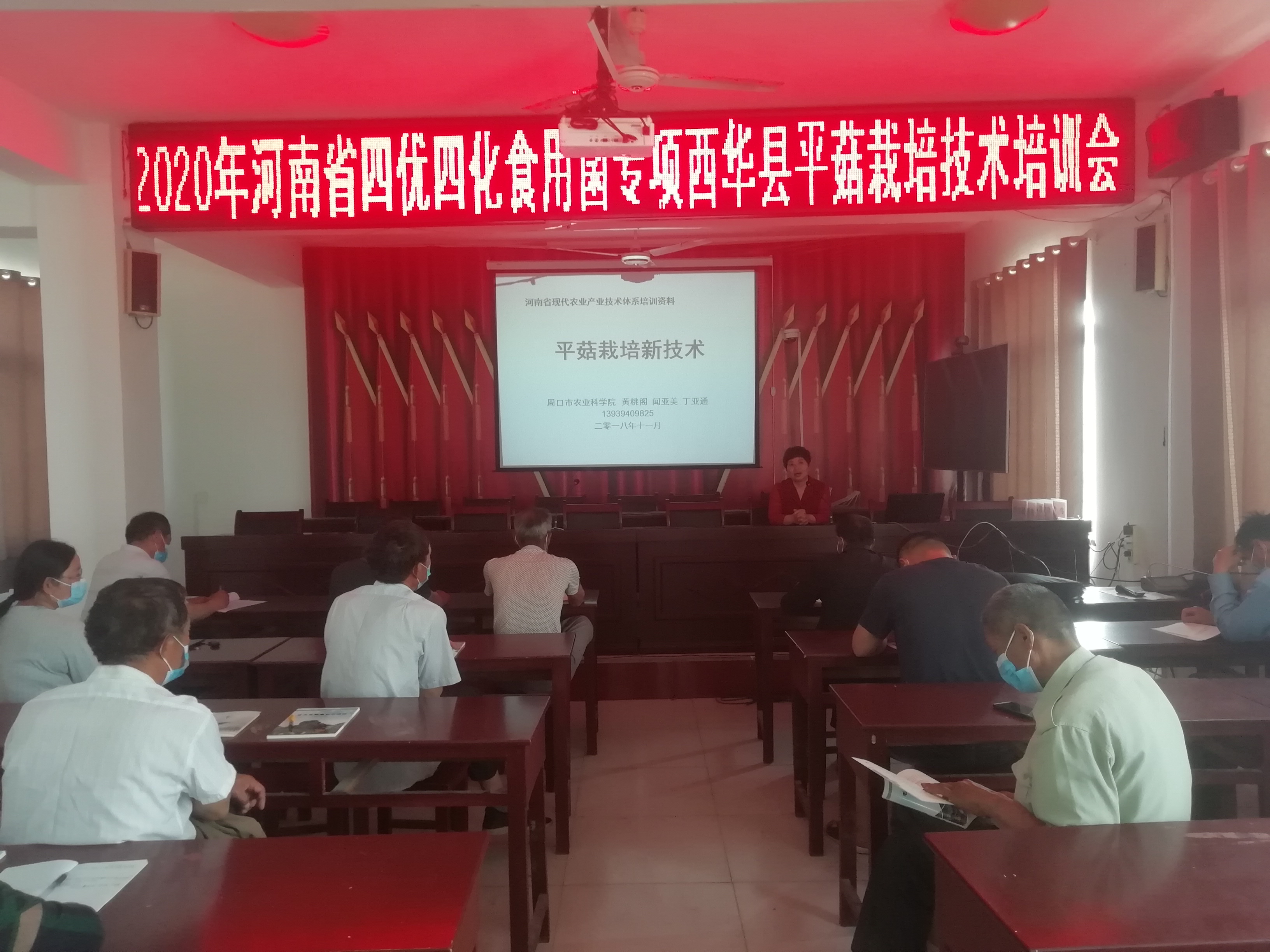 5月4日上午,2020年河南省四優四化食用菌專項西華縣平菇栽培技術培訓會在該縣大王莊鄉農民培訓中心舉辦?;顒友埵惺秤镁鷮<尹S桃閣進行技術指導、專題講授。來自全縣農科所部分農業科研人員、部分鄉鎮食用菌種植專業合作社負責人等40余人參加培訓。