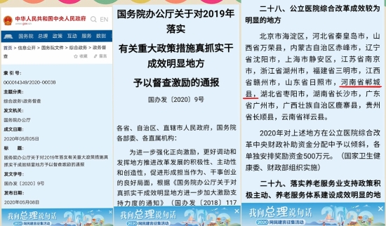 5月8日,中華人民共和國中央人民政府門戶網站發布《國務院辦公廳關于對2019年落實有關重大政策措施真抓實干成效明顯地方予以督查激勵的通報》國辦發〔2020〕9號文件,對213個地方予以督查激勵,相應采取30項獎勵支持措施。其中,鄲城縣榮登“對公立醫院綜合改革成效較為明顯的地方”名錄,獲獎500萬元。