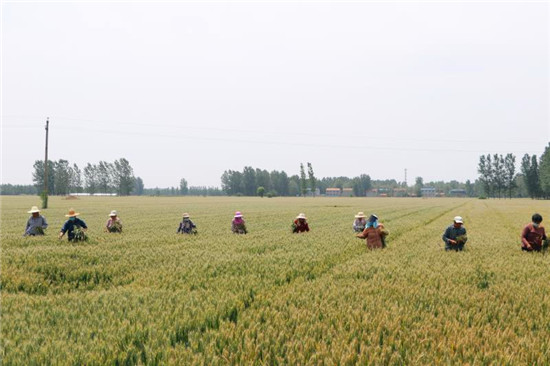5月16日,記者在鹿邑縣棗集農(nóng)場(chǎng)看到,2800多畝的良種小麥繁育基地里50多人分成四支隊(duì)伍一字排開,在綠波碧浪的小麥田里認(rèn)真排查、進(jìn)行提質(zhì)去雜工作。