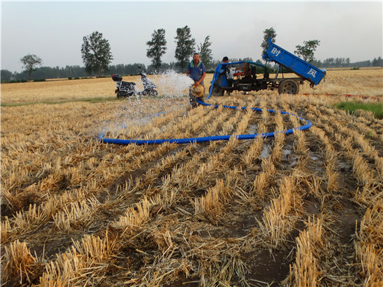 6月6日,沈丘縣周營鎮農民正忙著抗旱“造墑”、“補墑”澆水,期待奪取秋糧豐收。 近期來,由于連續多日高溫無雨,土壤墑情差,無法播種秋作物。針對當下嚴重的旱情,沈丘縣掀起“雙抗旱”(抗旱保苗、抗旱種秋)高潮。目前,該縣日出動勞力1.8萬余人,出動各類噴灌機械26000多臺(套),力保農田播種的玉米出苗。