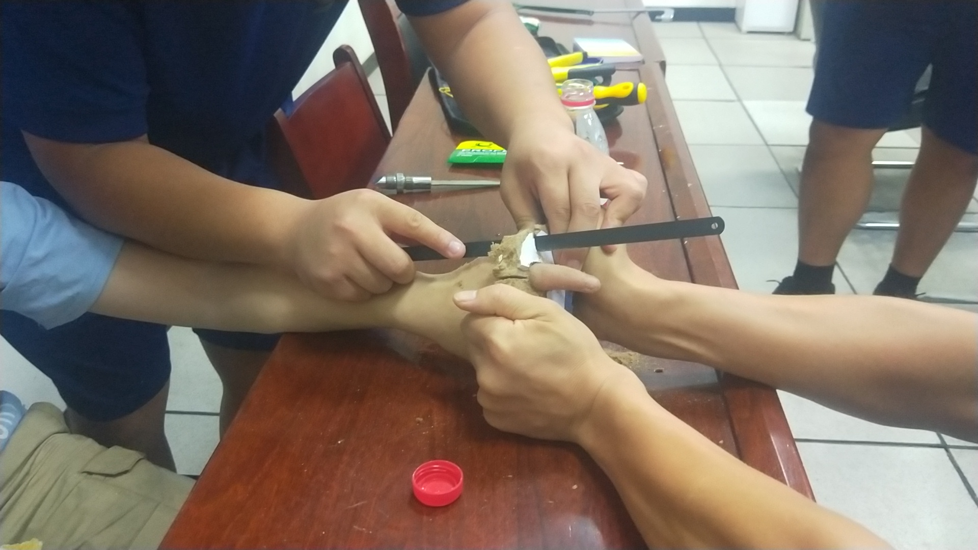 看到救援人員,小男孩十分害羞,有點不好意思。“我看桌子上有個孔,就是想看看手指能不能伸進去,結果就拔不出來了。”救援人員經觀察發現,小男孩左手無名指被卡在課桌木板上的小孔里,木板已被裁下,木板材質為鋸末壓縮板,此時小男孩手指被卡部位周圍已發生腫脹必須馬上處理。救援人員利用鋼鋸將木板一點點鋸開,然后又用鉗子用力將木板夾開,經過3分鐘救援,成功將禁錮小男孩手指的木板摘除。看到木板被從手上取下,男孩長長地舒了口氣。