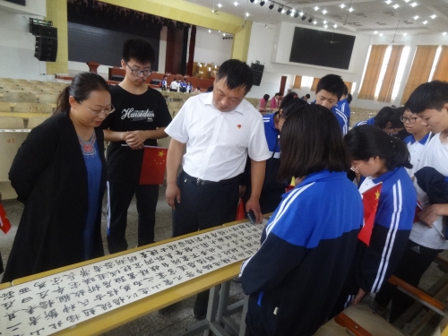 在展覽現場,商水縣文聯主席劉秋玲、商水一高校長關保證帶領師生一一觀看作品,時時做出鑒評。當被充滿好奇的學生問起書法知識時,他們都認真地一一答疑解惑。商水一高校長關保證為省書法協會會員,談起古代書法大家如數家珍。當看到懷素的草書臨帖時,他還不忘趁機給學生講解懷素苦練書法的勵志故事;看到《蘭亭序》,他又補充王羲之當時的創作狀態,學生聽后倍受鼓舞,一致給關校長鼓掌喝彩。他還給學生普及了題跋、朱白落款、印章、三大行書、米芾體、古代紀年方法、時令等書法知識。學生們認真聆聽,頻頻點頭,表示受益良多。一張張笑臉、一聲聲贊嘆,增添了商水一高喜迎雙節的祥和氣氛。