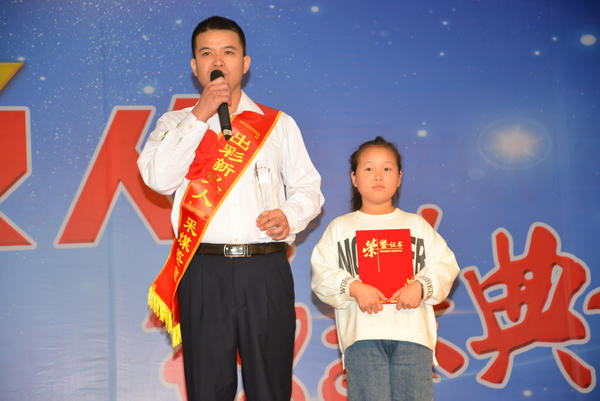 “節約能手”掘進一隊職工師振東在頒獎臺上接過12歲女兒頒發的獎杯后,還得到了“小棉襖”的熱情擁抱。