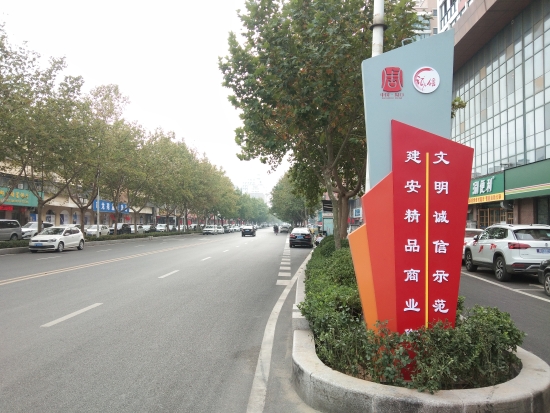 10月11日,記者在周口中心城區(qū)建安路上看到,一個(gè)造型精美,寫有“ 文明誠(chéng)信示范街”的指示牌亮相街道邊,為"創(chuàng)文"營(yíng)造了濃濃的宣傳芬圍。記者張洪濤攝