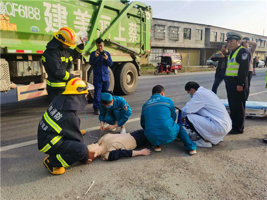 組織實施模擬演練過程中,上蔡縣公安局110指揮中心民警接到群眾報警后,迅即啟動方案,向交警大隊反饋事故相關情況,指令交警大隊事故處理中隊、有關部門和單位趕赴事故現場,實施救援處置。同時,向商水縣110指揮中心通報事故情況,請求協作開展交通事故應急救援工作。