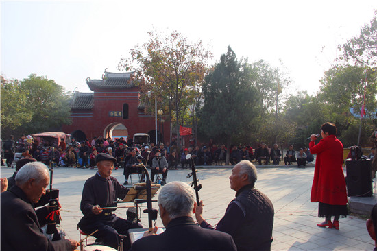 11月10日,戲迷朋友在商水縣郝崗鎮北社村千年古塔旁表演戲曲節目。初冬時節,暖陽普照,壽圣寺古塔附近的戲迷和樂器愛好者自發來到千年古塔旁表演戲曲節目,為當地群眾送上精彩的文化大餐,進一步活躍了農村文化生活。①15周口日報·周道客戶端記者付永奇 通訊員 呂耀光 攝
