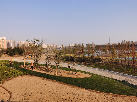 11月11日,在中心城區沙潁河北岸周口大道至八一大道段生態改造工程EPC項目施工現場,施工人員正在進行地被植物的種植、綠化樹木的養護。
