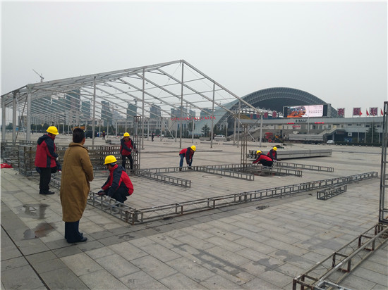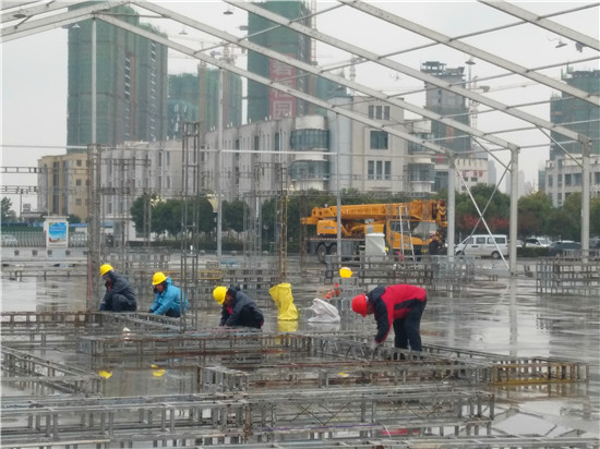 為迎接11月28日至30日舉辦的周商產品展示展覽活動,現場70余名施工人員不顧天氣惡劣,抓緊搶干工期,爭取在11月25日全面搭建完畢。