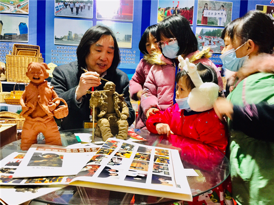 鄲城縣泥塑藝術大師張振福應邀攜48件作品參加大會,成為展會的一大亮點。其中原生態泥塑作品18件,有《磨豆汁》《耕耘》《酒逢知己》《二胡曲》等,鈞瓷泥塑作品20件,有《大金蟬》《年年有余》《豫東娃》《瑞牛迎春》等。張振福的作品表現豫東的鄉村人物,作品突出個性,憨態可掬,深受觀眾的喜愛,大家紛紛駐足觀看。