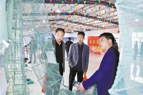 商水縣練集鎮按照“一鎮一主業”要求,在中楊莊村設立鎮工業園區,在各村設立扶貧車間,大力發展漁網編織業,全力打造我省最大的漁網小鎮。圖為外地客商在練集鎮漁網展廳選購產品。記者 付永奇 攝
