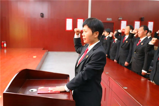 宣誓儀式開始,全體起立,奏唱《中華人民共和國國歌》。隨后,領(lǐng)誓人張冬梅左手撫按《中華人民共和國憲法》,右手舉拳,誦讀誓詞。其他宣誓人列隊肅立,舉起右拳,莊嚴跟誦。