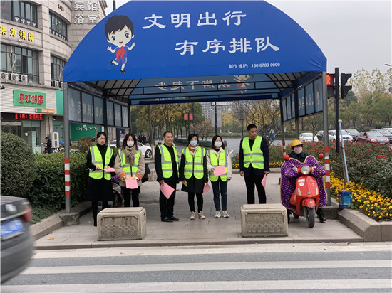 “您好,現(xiàn)在是紅燈,為了安全請等綠燈后再走。”“請再往后退一點,不要擋住汽車通道……”12月5日是第35個國際志愿者日,當日上午8時,正值人流高峰期,在浙江省杭州市富陽區(qū)春江街道大橋路和春南路交叉口,志愿者崔守領一行人身著反光背心在該路口緊張忙碌著,勸導行人文明出行、安全出行,為冬日的杭州增添了一股股暖意。