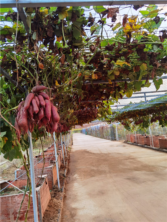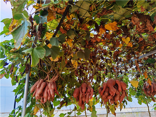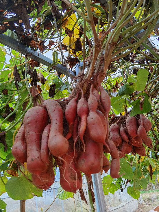 西華縣農科所積極開展“空中結薯”試驗種植研究,并取得成功?!翱罩薪Y薯”采取嫁接技術,選用旋花科植物牽牛作砧木,脫毒薯苗作接穗嫁接而成,嫁接成活后栽到土壤里,搭建棚子,加強薯苗水肥管理,每株插一根小竹木桿,促進薯苗快速生長上棚,在棚上吊花盆,盆內放蛭石,生長到掤上的薯秧壓到花盆里,加強水肥管理。90天結薯,進入10月份把花盆去掉。該技術打破傳統栽培方式,主要為公園、科技園區、農業生態觀光園、家庭庭院內培植,有很好的科研價值、觀賞價值和農業推廣價值。周口日報·周道客戶端記者李鳳霞 攝