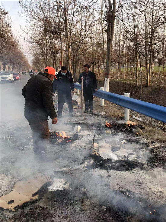 當日下午4點左右,太康縣交警大隊二中隊指導員南應開及輔警郭旗全、魯迪、尹晨豪正在趙堂村附近巡邏時,猛然看到前方一輛電動三輪車上有煙氣冒出,巡邏民警加速趕到。原來是一名老漢的一輛拉著廢舊紙箱的電動三輪車著了火,一車廢紙和塑料瓶散落一地正在燃燒,火越燒越旺,只見老漢正在手忙腳亂地滅火。這輛三輪車上拉的全是廢塑料、硬紙殼等易燃物,而且當時正刮著風,如果不及時滅火任由火勢蔓延,后果將不堪設想??吹酱饲闆r后,南應開迅速從警車上拿出滅火器秒變“消防員”,對著起火的物品進行滅火操作,同時安排輔警對過往行人和車輛進行疏導。由于發現和撲救及時,在民警的緊急救援下,火源很快被眾人合力撲滅。對太康交警面對火情臨危不亂、果斷處置、幫助群眾的行為,老漢車主和過往群眾紛紛點贊。②6