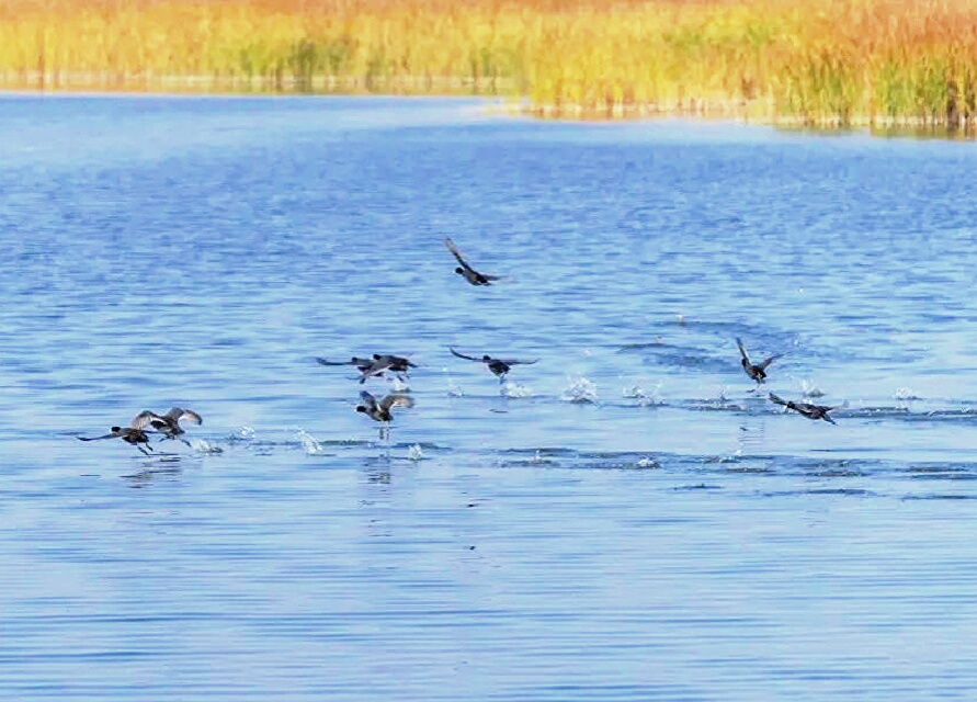 近日,我市天朗氣清、惠風和暢,引黃調蓄工程天藍水碧、水天一色的風景令人心曠神怡,其良好的生態環境吸引了很多水鳥前來棲息,如銀鏡一般的湖面上綠頭鴨、赤麻鴨、白鷺、灰鷺等禽鳥成群結隊,姿態各異。水鳥、湖水與藍天交相輝映,風光旖旎,盡顯詩意。