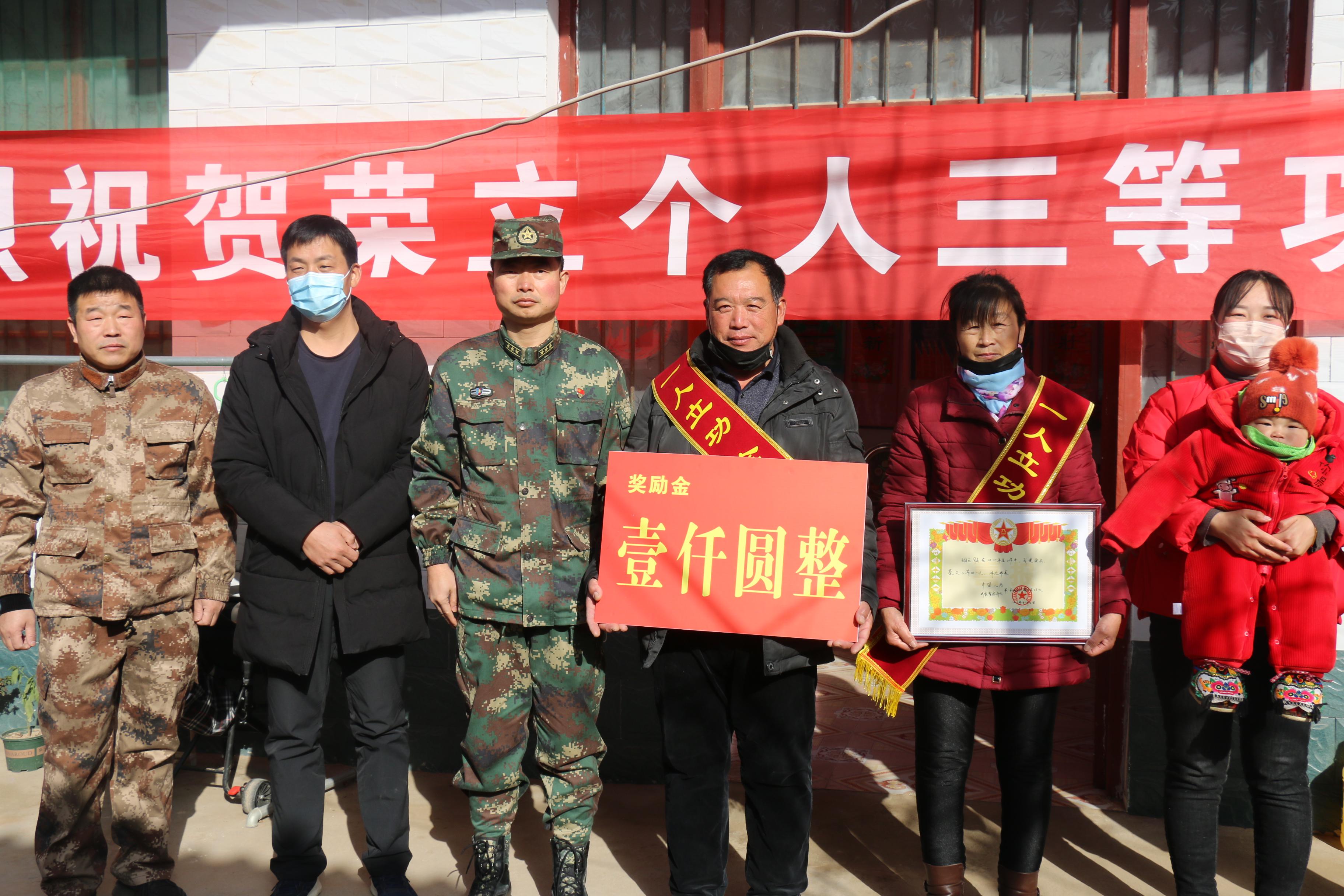 1月12日上午,西華縣西華營鎮雙樓村某部士官高志豪家中鑼鼓喧天,喜氣洋洋。該縣人武部政委涂友佳、縣退役軍人事務局局長龔坤敬一起把二等功喜報和“一人立功,全家光榮”的紅色綬帶及5000元現金等送到高志豪及其父母手中。
