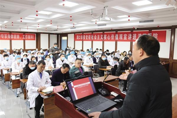 本報訊( 記者 侯國防 通訊員 艾義麟 文/圖)為學習貫徹黨的十九屆五中全會精神,近日,周口港區醫院(周口燒傷醫院)邀請市委黨校老師以“以黨建引領醫院高質量發展”為主題,開展黨的十九屆五中全會精神宣講活動(如圖)。周口港區醫院董事長孫繼祥、院長賀志勇、副董事長張巋、黨支部書記兼行政副院長苑慧毓、副院長王瑞海、業務副院長高山、監事會主席譚玉峰等院領導班子成員及醫院全體干部職工參加活動。