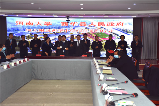 在與會領導的共同見證下,西華縣委副書記、縣長田慶杰與河南大學黨委常委、副校長許紹康簽訂戰略合作協議書;西華縣經濟技術開發區管委會主任宋廣良,河南大學附屬中學校長蔡建東,河南博遠教育投資有限公司董事長樊元玲共同簽訂河南大學附屬西華中學項目協議。