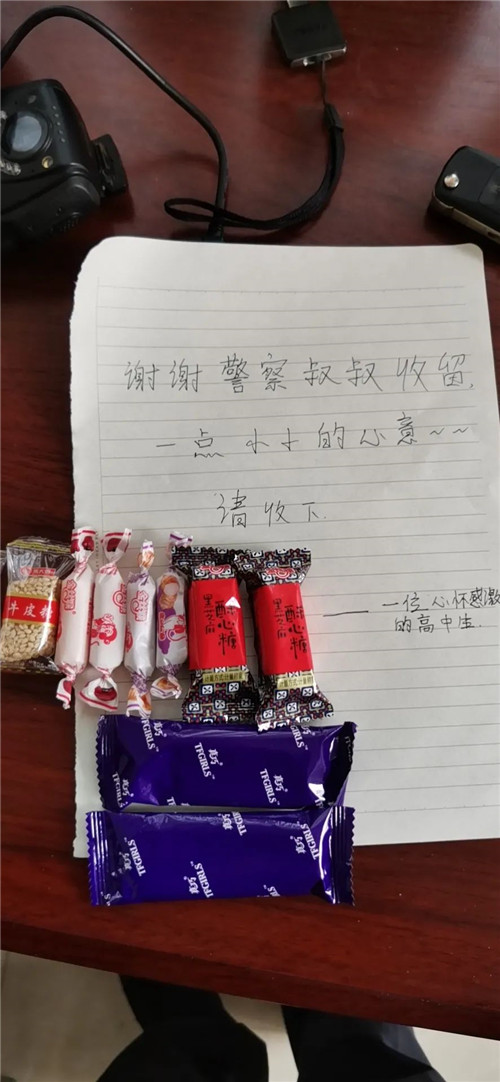 在交警忙于執勤時,女孩悄然離去,臨走前留下一封簡短的感謝信和幾顆糖果。