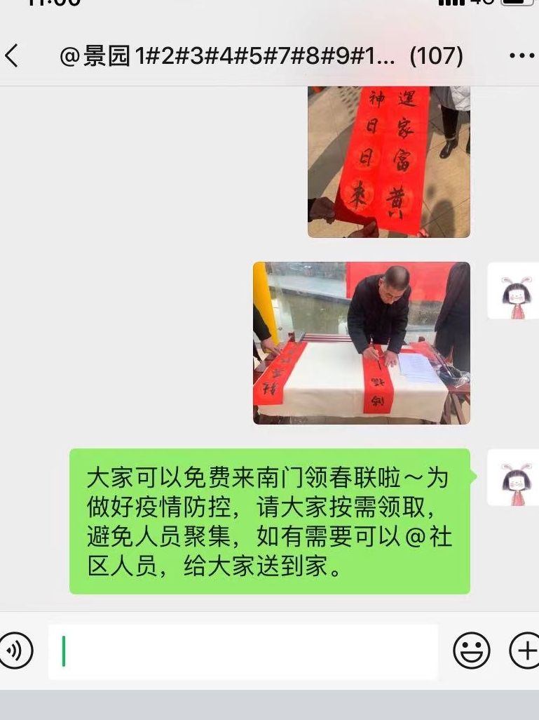 2月3日,為做好社區防疫工作,周口市城鄉一體化示范區景園社區一改往年現場寫、集中送的免費送春聯活動形式,把“寫春聯”與“送春聯”分開,通過微信群向社區居民展示書法愛好者的春聯作品,讓居民在線挑選,按需有序領取,避免人群聚集。同時,針對社區老年人等行動不便群體,主動送春聯上門,確保送“?!迸c防疫兩不誤。