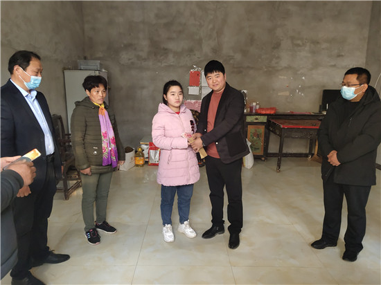 “你要好好學習,勇敢堅強,樂觀面對生活,有困難我們會盡力幫助你!”2月7日,在鄲城縣汲水鄉張嶺村,該鄉副鄉長楊衛杰、愛心人士魏昌宏、汲水二中校長陳法杰把2000元錢和棉襖、米面油等生活用品送到建檔立卡貧困戶學生張慧敏手中,為她送去特別的關懷和溫暖。