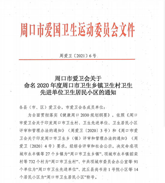 近日,周口市愛衛會命名周口市衛生鄉鎮、衛生村及衛生先進單位,鄲城縣12個鄉鎮、60個行政村、19個單位榜上有名。