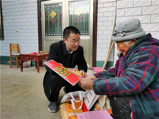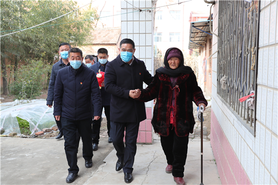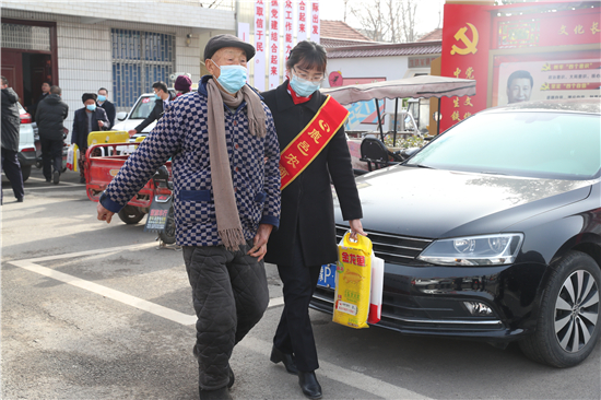 在鄭家集鄉韓樓村,縣農商銀行鄭家集支行行長武繼龍帶領員工來到92歲韓老漢的家中,看到韓老漢由于身體原因只能靠拐棍佝僂著背站著,武繼龍緊忙彎腰俯下身說:“大爺,快過年了,我們來看看您,提前給您拜個早年!”“真的是太感謝恁了,這么冷的天,還讓你們來送到家里面。”韓老漢激動地說。