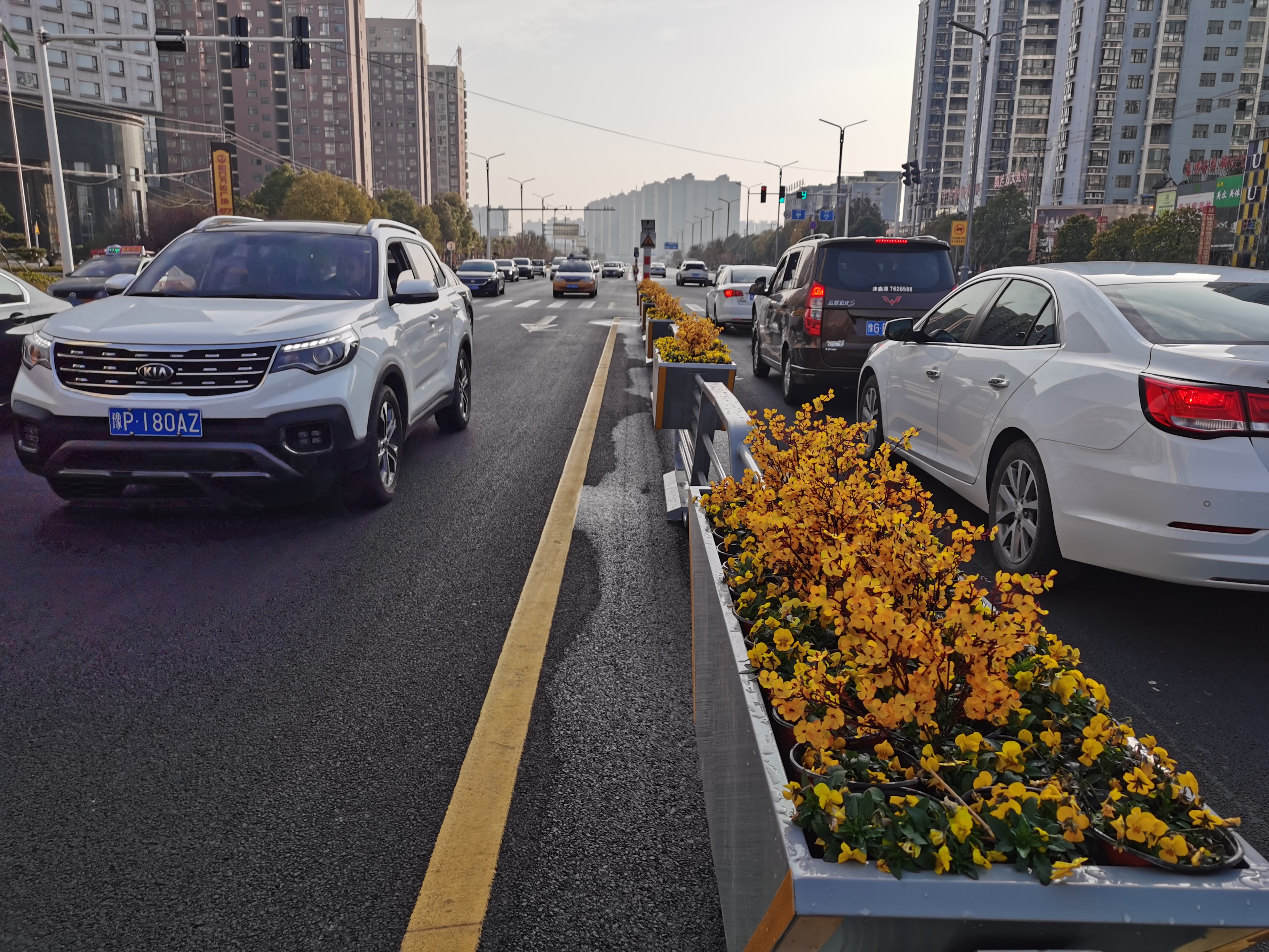 2月10日,走在商水縣陽(yáng)城大道,發(fā)現(xiàn)快車道中間的欄桿換成帶花卉盒栽的新型欄桿,銀灰色的簡(jiǎn)潔造型的欄桿、紅、藍(lán)、黃等各色花卉,扮靚了充滿節(jié)日喜慶氣氛的商水縣城。