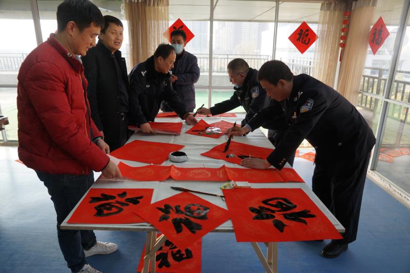 金牛賀歲來祥瑞,翰墨飄香迎新春。為弘揚中華傳統文化,落實“從優待警”舉措,傳遞市局黨委的親切慰問和關心關懷,豐富警營文化生活,營造歡樂祥和的節日氛圍,2月9日,項城市公安局在三樓大廳開展書贈春聯活動,孫沄、閆永紅等5名警營書法家及16名蓮溪書院師生揮毫潑墨,現場為民警、輔警及工作人員義寫春聯、福字2000余套,受到了廣大民警、輔警的熱烈歡迎和充分好評。