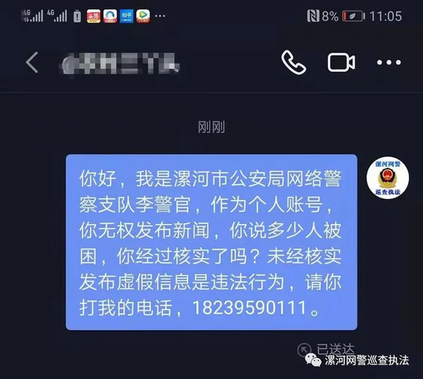 全面了解真相后,為防止謠言傳播,漯河市公安局網警支隊民警立即利用《漯河網警巡查執法賬號》在該抖音下留言:該信息不實,要求網民不信謠、不傳謠。當晚,抖音網民張某看到民警留言后,主動刪除了該條視頻作品。
